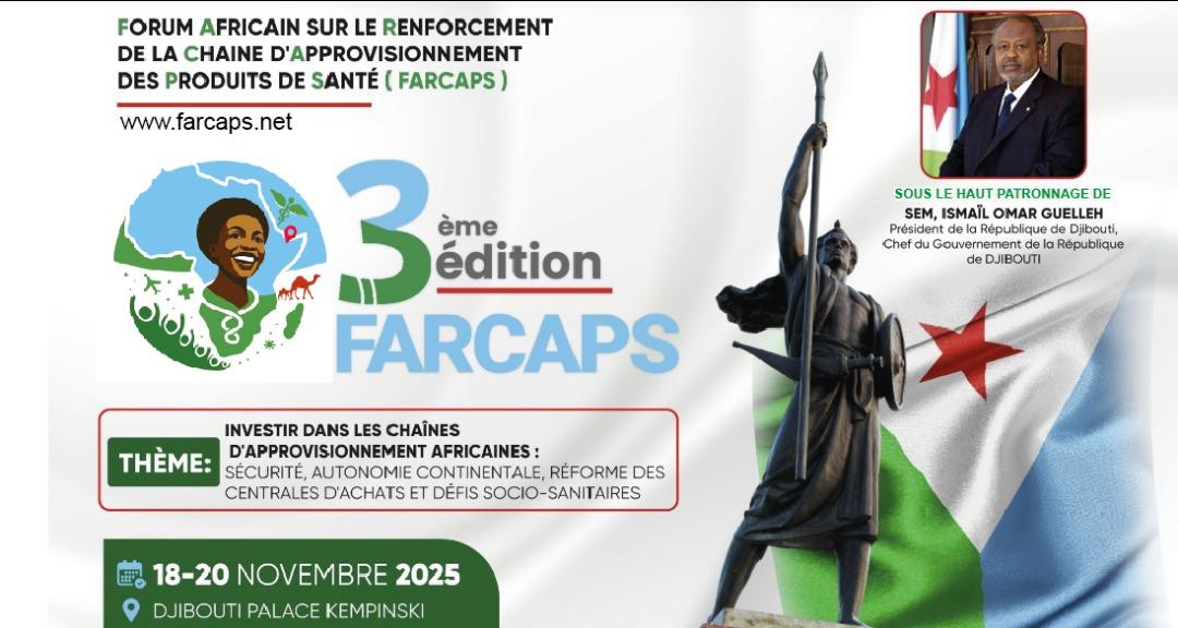 La 3ᵉ édition du Forum Africain sur le Renforcement de la Chaîne d’Approvisionnement des Produits de Santé (FARCAPS) se déroulera du 18 au 20 novembre 2025 au Djibouti Palace Kempinski, sous le haut patronage de S.E.M. Ismaïl Omar Guelleh, Président de la République de Djibouti. Cette rencontre majeure rassemblera les ministères de la s...
